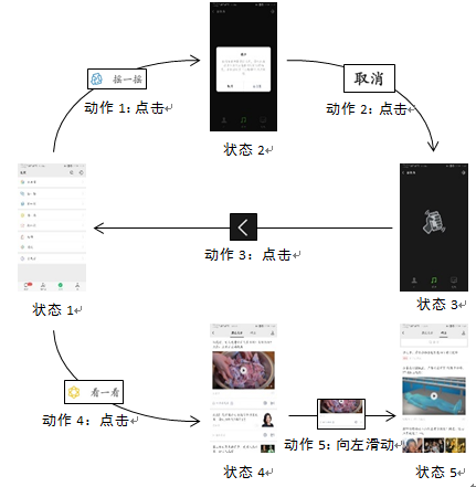 人工智能中的强化学习技术可以学习人类生成的交互轨迹,并根据当前UI状态和最新状态转换中的视觉信息生成类似人工的测试输入。神经网络可以学习用户与app的交互,可以根据所学模型为任何新的UI生成类似人工的输入,达到比传统的测试输入生成器更高的覆盖率和更快的速度。下图为应用强化学习进行GUI测试的有向图,其节点是UI状态,边是使得UI状态变化的动作: