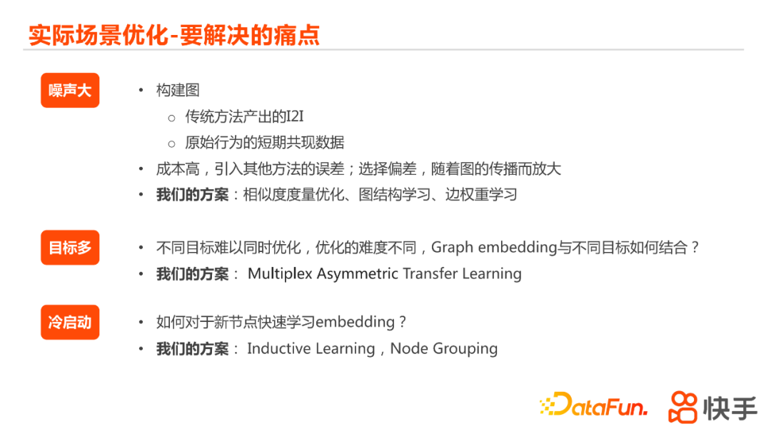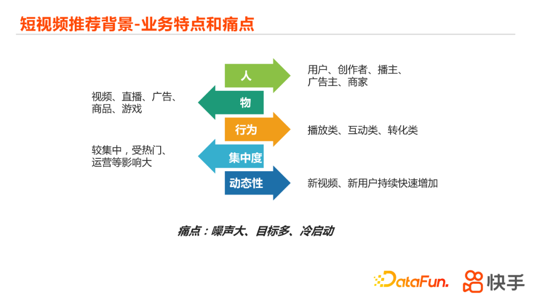 这些人物行为结合在一起,体现在短视频的场景下有两个特点:集中性和动态性。集中性,是说绝大部分的行为会集中在一些热门或者一些运营活动带来的视频上面。动态性,指整个平台上面的新视频、新用户都是在持续的快速增加的,会使得整个系统的一直在持续的动态变化当中。上面这些特点也就导致了我们在短视频的推荐当中会面临一些痛点,主要包括:噪声大,目标多,以及冷启动的问题。