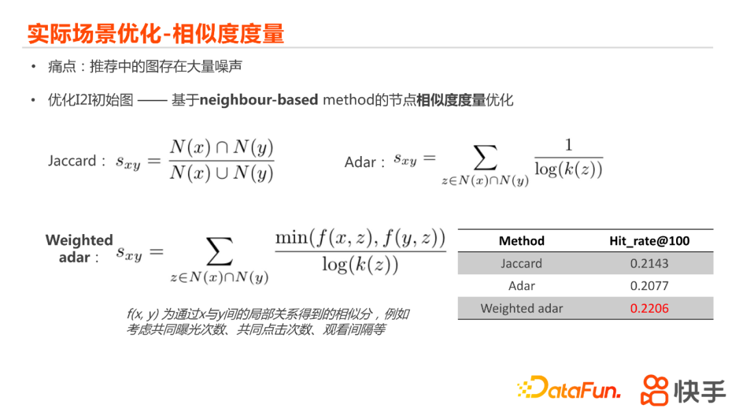 相似度度量优化是指基于其他方法产出I2I的初始图去做优化,我们使用了一个简单的小trick,是基于这种neighbour-based method(基于近邻的方法)的节点相似度度量优化。产出原始的I2I的图的比较常用的方法有Jaccard相似度(考虑两个节点之间它的共同邻居和所有邻居的关系)和Adar相似度(计算共同邻居里面对于邻居热度做一个加权)。这里我们发现不同的邻居,对于这两个节点来说,它的作用其实并不仅仅体现在这个节点和邻居节点的热度上,举一个例子,我们要从X点到Y点之间有存在很多流水的管道,从X到Y的话,我们要经过Z点,整个X到Y它的流水流速,是由X到Z管道的直径和Z到Y管道直径这两个里面较小的这一段管道来决定。所以我们在基于Adar的基础上,对它的分子做了一个加权,这个加权表示XZ和YZ这两段管道直径或者是说在我们场景里面一个相似分的表示,这个分子的权重是由较小的值来决定的 。相似分我们可以简单地只通过比如说它们的共同曝光、共同点击或者观看间隔等统计量去表示。我们通过简单的这一个小的trick的优化,其实可以在离线Hit-Rate的上面看到一个比较明显的一个提升。