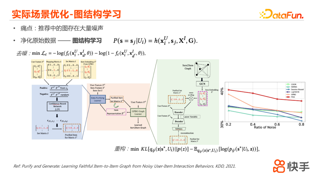第二个优化的方式的话是基于对原始数据的净化去做,我们采用是一个图结构学习的方案,这个工作是跟清华崔峰老师实验室一块儿合作去完成的。整个的算法的框架,分为两大部分,左边这部分是基于重采样的数据去噪的模块,右边是基于用户个性化行为embedding学习的模块。左边我们会首先去训练得到一个置信度的网络,网络代表的是对于用户和我们场景中也就是视频User&Item这个pair有多大的置信度是一个真实的行为,也就是说用户对于他有行为的视频有多大的置信度(是真的是有行为,还是因为一些其他原因比如误点或者一些运营的因素影响才去观看)。在置信度网络的基础上,我们比较特殊的点在于利用了一个user和set的信息,set里面包含的是在一个session当中,用户所观看或者是有行为的所有的视频的集合,然后我们会利用网络对于user的set做一个重采样,这个采样的过程其实可以理解为是通过一些用户长期稳定的行为去对他短期行为做了一个过滤,得到一个净化过后的set表示。然后就会到右边的图机器学习的模块当中,我们利用净化之后的set,以及我们需要得到的I2I的图的关系、I2I的embedding,然后我们会利用I2I的embedding对于净化后的set做一个pooling的表示。之后会接一个VAE的结构去对set做一个encoder和decoder,希望能重构出来用户净化过后的set集合的表示。去噪和重构这两部分的loss是我们整个模型里面所有的loss。这样的方案我们可以在理论和实验当中看到它的一些优势:最右边这个图,它的横轴是我们在数据集中插入的噪声比例,纵轴是不同模型的准确度,上面这条红线是我们提出的模型的表现。可以看出,它对于噪声来说是更不敏感的,也就是它更鲁棒的。这个工作已经在今年的KDD被录用了,有兴趣的同学可以去关注一下Paper。