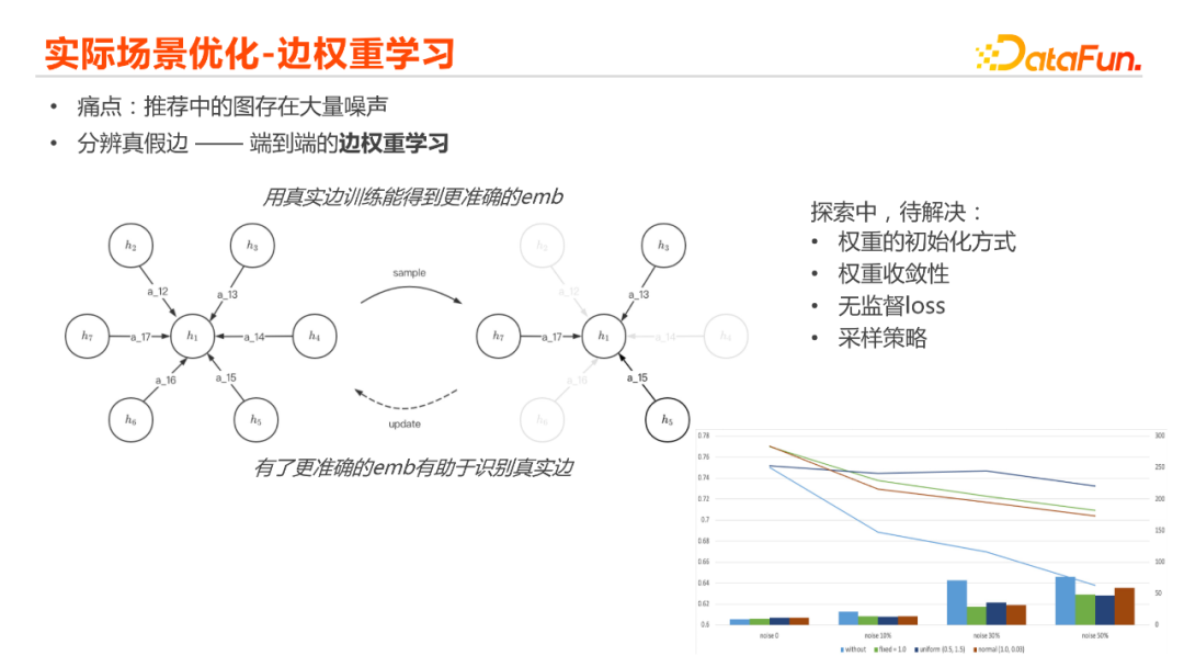 第三部分,我们主要是基于上线成本的优化。其实上面的工作,理论和离线实验的结果是比较好的,但是因为有去训练confidence的model的过程,这在我们上线过程当中,成本是比较高的,我们想有没有一些方法能去快速的进入我们线上的流程。我们有一个很直接的方式,如果有一个图,它里边不管通过什么方式,我们知道它们存在一些边,我们通过什么样的方法能去分辨出来这些边的真实性,于是就提出了一个端到端的一个边权重的学习,intuation(直觉上)也比较的简单直接,其实就是如果我们能知道对于当前这个节点,它所有邻居、它的边的权重表示的是这条边的置信度,我们就能去根据置信度以更大的概率采集到真实的边,然后在真实的边的基础上再去做embedding的训练,能得到一个更准确的embedding的表示。反过来,如果我们有更准确的embedding的表示,也能有助于我们识别出来原始图中哪些边是真实的边,哪些边是虚假的边。这样的话我们相当于是把之前图的训练过程前移到了这个图的连续采样过程中,然后这两部分去做一个循环迭代。我们在一些实践场景中的数据也能也能看到一些比较明显的优化效果:最右边的图与上边的图类似,横轴是数据当中插入的噪声边的比例,纵轴是模型的表现,上面这三条线其实都是用了边权中学习的一些方法,它们区别是用了不同的边权重的初始化方式,浅蓝色这条线是没有边权重学习的表现。不难看出我们加了边权重学习之后,整个模型的鲁棒性是提高的,另外底下的柱状条表示的是当下model达到最优这个点的时候,所需要循环迭代模型训练的迭代轮数,也能看出加了边权重学习,达到最优点的时候,它需要循环迭代的次数是更少的。