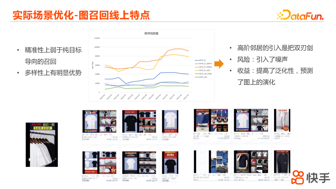 上文我们之前介绍到的一些方法,在快手的一些业务场景中也有一些线上应用和优化的结果。我们从一些场景中观察到的基于图的召回,相对于纯目标导向的召回,它在精准性上是相对来说更弱一些的,但是它有一个比较明显的优势,就是多样性上的优势。这个曲线图就比较有意思,横轴是上线之后不同的日期,纵轴代表的是这一路召回推荐出来不同的视频量的和,这里面橙色的线是我们graph(图)召回的情况,可以看出,它在这个过程当中有几次畸越,随着训练,图召回的不同视频量是会递增的,召回的递增其实也在为其他不同的路带来更多不同种类的样本,也会带来其他路召回量的提升,所以使得整个场景的多样性有更好的表现。基于之前一些实验的结果,我们认为就在图里面把高阶的邻居引入其实是一把双刃剑,在风险上来说,它引入了这些高阶邻居里面的噪声,也是因为这一点,我们现在主要工作是集中在如何对数据去噪,它的收益的主要体现在提高整个模型的泛化能力,能去预测图在未来的演化,这其实跟召回本身的目的也是一致的。这页展示了我们在场景中的一个case,是商业化广告场景,最右边是使用了图召回的方式,最左边是trigger:黑色和白色的T恤。可以看到之前目标导向的I2I,推荐出来基本上都是白的或者黑的T恤,然后右边图的方式,可以看到有不同款式、不同颜色的T恤,还有一些相关的裤子类的商品。我们认为这对于我们整个场景的生态发展是更优的。