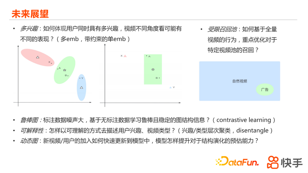 最后跟大家聊一下,我们认为在图召回上未来可能的一些技术方向展望。首先是多兴趣,我们认为用户他肯定不是只有单一兴趣的,怎么样去描述多兴趣?要么是利用多embedding,要么是带约束的单embedding,这样其实都会有一些问题,例如:embedding数量怎么去设置,单embedding甚至是不是能表达多兴趣等。我们现在一个思路是,之前学习节点的embedding都是对它做点的预估,也就得到一个固定的embedding的表示,我们是否能学到一个embedding的分布,然后对于不同的点,它的embedding都是有一个分布的范围,如果我们在做召回的话,就能根据比如对这两个节点去计算它们相似度的时候,根据他们的分布去得到一个比较适合的一个采样,到它真正一个embedding表示之后,再去计算它的相似度。这样在不同的兴趣上面的话,我们是希望能通过得到一个在分布中采样到不同的节点的表示,然后来实现多兴趣的目标。第二点是受限的召回池,主要是在商业化场景中比较明显,是说整个场景中自然视频的量和行为数是远远大于广告视频的,但是我们实际场景中更希望是能得到这部分广告视频的更精确的embedding,怎么样利用全集的数据去重点优化有特定限制的召回池的效果,这也是我们认为在实际场景中比较重要的一个问题。其他的话,对应上文提到的去噪的优化,就是如何得到更鲁棒的图,我们后面计划引入一些contrastive learning(对比学习)或者unsupervised learning(无监督学习)的方式去做优化。以及还有可解释性、动态图的优化,这些跟我们整个场景的生态、业务需求都是强相关的,我们认为未来比较值得去做持续的优化。