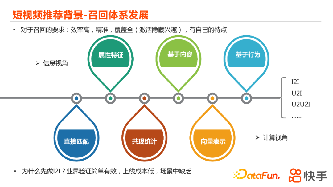 整个召回的发展可以从信息和计算两个视角来看。从信息视角来看,最简单的,可以只利用一些待召回物的属性特征,比如视频的作者信息,或者它的一些标签。随着NLP、图像、语音技术的发展,我们现在可以基于视频提取出它本身内容的信息,比如标题信息、视频里面关键帧的信息、还有一些语音信息,此外,我们其实还可以加上用户的行为数据,去得到更好的关联召回结果。从计算视角来看,如果我们只利用一些简单的属性特征,召回可以直接基于一些匹配实现,比如相同作者的其他视频,或者相同标签下面的其他视频。如果还有一些内容和行为数据,我们可以利用CF(协同过滤)的共现统计去得到待召回的内容,现在最常用的是通过向量去计算得到召回的结果,我们会把包括属性、内容、行为的信息转化成embbeding的向量表示,然后通过向量相似度计算的工具去快速得到待推荐召回结果。现在常用的召回方式有I2I(商品到商品)、U2I(用户到商品)、U2U2I(用户到用户到商品)等。
