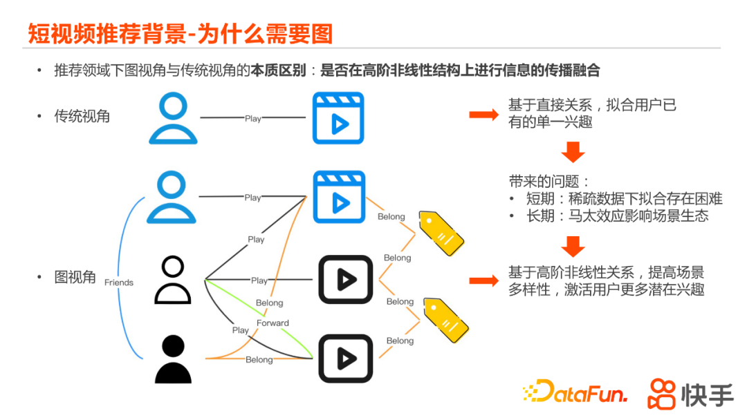 为什么要通过图的方式去实现这个工作?从传统的视角来看的话,推荐是说给了一个用户,尽可能去召回他感兴趣的视频,这个关系是直接的一阶关系,我们的model也只拟合了他当前的单一兴趣,但是如果把用户和视频展开来看,把它变成一个图或者一个网络的话,可以发现用户和用户之间、视频和视频之间、用户和视频之间其实还都存在着各种各样更多的、不同的、复杂的关联。