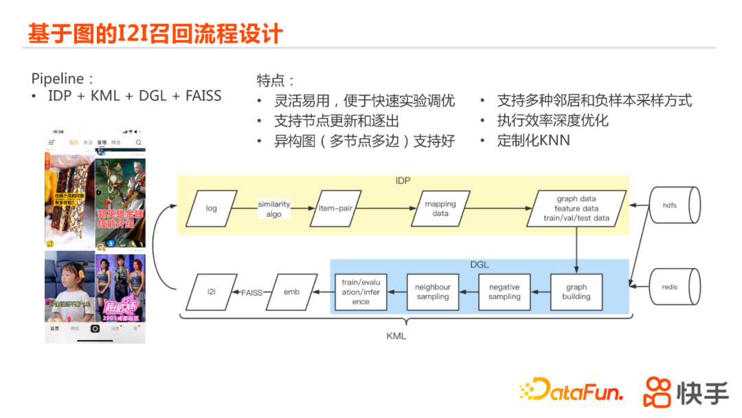 接下来给大家介绍一下现在我们快手使用的基于图的I2I召回的pipeline,我们的pipeline主要是基于IDP、KML、DJL、FAISS这些平台和工具去搭建的。IDP是快手内部的集成开发平台,它主要的功能是做一些数据处理,并且实现这种离线数据的任务调度。KML是我们自己开发的一站式机器学习平台,主要是能帮助我们做模型的训练预测和模型管理。DGL是和FAISS更是整个工业界目前比较优秀的框架和工具。我们在这些工具和平台的基础上进行了一些特定的封装和优化,就生成了我们现在整个的基于图的I2I召回的pipeline。