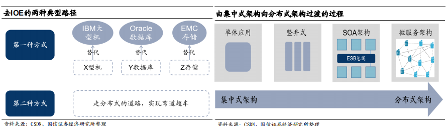 对于银行系统的国产化浪潮,一般业内公认的有两种方式:第一种,了解熟悉并拆解海外产品的原理、架构,然后通过自有技术重新开发一套性能与之相仿的系统(比如可以制造出用于承载银行核心系统的类似IBM大型机的设备;或研发出可以替代Oracle数据库的国产数据库);第二种,则是通过分布式的方式,用普通PC服务器集群代替了大型机应用。