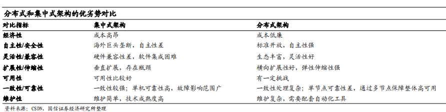 1)经济性:以往的集中式架构大多依赖于IBM的整体大型机和小型机,动辄十多亿,以X86服务器为主的分布式架构,成本较为低廉;2)可扩展性:集中式架构的IBM大型机,一般在扩展的时候只能够不断提升单机性能,但每个单机性能有极限,所以在扩展性上比分布式架构要弱;3)自主性:以往传统的以IBM大型机为核心的集中式架构由于核心技术和设备均掌握在海外厂商的手里,所以自主性较差,而分布式架构主要依赖于X86服务器,自主性较好;4)灵活性:集中式架构一般都是封闭的系统,有自己的硬件设备同时配有操作系统,而分布式架构大多数的开发技术源于开源社区,各大厂商广泛参与,所以灵活性较好;5)运维难度:由于分布式架构采用大量的X86服务器来实现处理能力和高可用性,所以系统内部的服务器数量较大,维护起来较为不便,而集中式架构的设备数量较少,运维较为简单;6)可用性:分布式架构的基础设施包括云平台及网络、复制及存储、同步软件等可用性有一定的挑战,相比集中机构的可用性较好;7)一致性:集中架构的一致性较强,单机可靠性高,而分布式架构由单节点可靠性差,需要通过多节点保障整体高可用性。