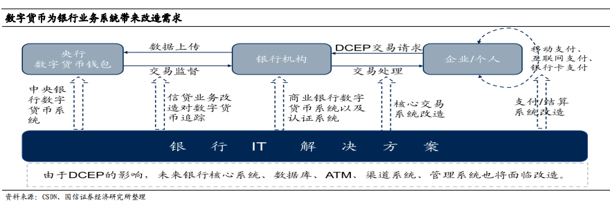 从中长期来看,数字货币为整个银行IT产业带来了增量的IT建设需求,具体来看:1)从发行端来看,数字货币的主要发行方为央行,所以最终的数字货币是由央行统一监管的,在央行的发行端要建立一套完整的数字货币系统,但此套系统一般为央行自建,所以对于银行IT厂商来说机会不大;2)从运营端来看,数字货币由央行发行,由国有大型商业银行进行运营,再由大型商业银行对接中小银行,运营侧给予银行IT厂商提供的需求较多(对于国有大行来说,需要建立一套数字货币交易、监管、报送等系统,按照惯例国有大行一般会找和他们长期合作的银行IT供应商来具体落地实施;对于中小银行来说,一方面也需要依赖银行IT厂商去建立数字货币的整套系统,另一方面也需要依赖银行IT厂商去建立与国有大行的对应接口);3)从流通端来看,主要涉及到线下多场景的支付和结算,也会为银行IT厂商带来一定的改造量,比如现在的ATM机需要改造以适应数字货币和现行货币的兑换、POS终端要支持数字货币的支付与结算。