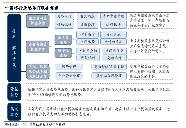 从需求目前随着银行IT景气度提升,银行客户对于IT建设及服务的需求亦表现出全方位的需求,主要集中在银行IT解决方案的建设、外包服务的提供以及集成服务。具体来说:1)银行IT解决方案,根据IDC,银行IT解决方案主要分为渠道类解决方案(主要帮助银行业务更好的触达客户)、业务类解决方案(主要有包括核心业务、支付与清算、信贷操作、中间业务等的基本类业务解决方案和包括互联网金融、开放银行、互联网信贷、交易银行的数字化业务,这些业务类的相关系统是银行维持正常运转的基础系统)和为管理、风控及合规类相关解决方案(此类解决方案主要为银行管理人员提供检测、风控及商业决策的支持);
