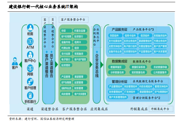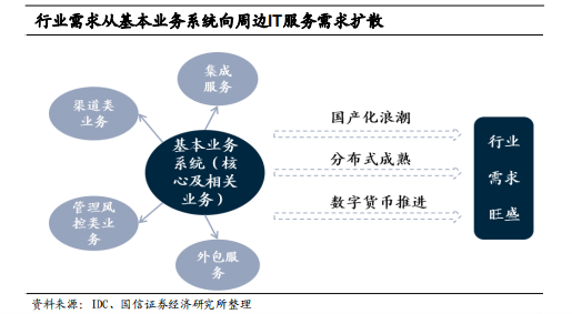 此次的银行IT需求大潮,主要以银行核心业务系统驱动,并逐步扩散到渠道类业务、管理风控类业务以及集成、外包等服务范围。大行建设需求较为迫切的以核心业务系统为主的改造,由于核心业务系统事关重大且系统的稳定和安全高于一切,所以在目前情况下,中农工建交邮储等国有大行还不能够完全用分布式架构技术改造核心业务系统,但是都在积极尝试主机下移,逐步从渠道类、管理风控类等业务系统开始分布式改造,进而延伸出系统集成服务以及外包服务等需求。