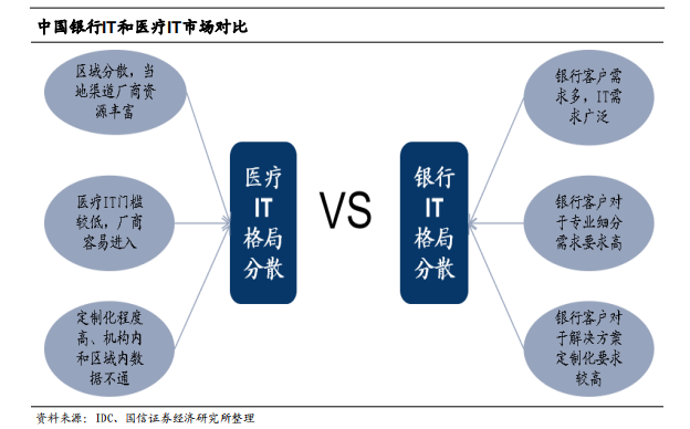 1)银行IT的整体市场规模较大,根据IDC,2019年银行IT投入规模在1327.2亿元左右,而医疗IT投入规模在548.2亿元左右,粗略测算银行IT规模是医疗IT的2.4倍。银行IT投入较大的背后是整体银行业在管理数十万亿资产背景下的庞杂IT系统,从交易到管理,从流程到结果,从合规到风控,从前台到后台等都有较多业务需求;2)银行IT厂商在每个细分领域都较为专业,横向拓展较难,这点主要体现在银行客户对IT服务商的严苛要求,不管是外包服务、集成服务还是解决方案,银行客户由于对风控的重视,所以对供应商资者审核较为严格,一般会要求服务商具有成功应用的案例,而医疗IT行业的行业准入门槛较低(尤其是前些年对于HIS系统的建设),一般有渠道的第三方小厂商可以轻松接到当地医院的项目。