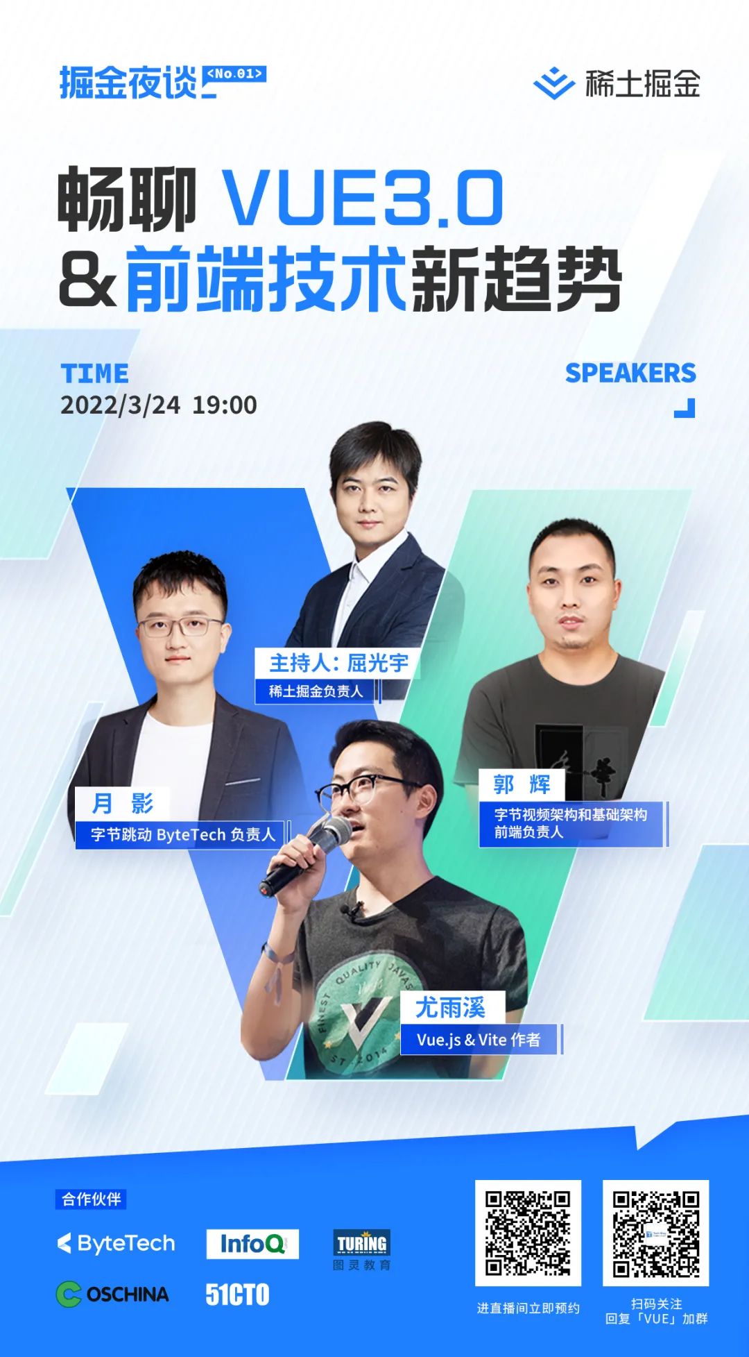 在过去的几年中,Vue 3.0 已经跨过了技术采用生命周期的鸿沟,走向成熟。国内的前端开发者们,也可以抓紧时间投入到对 Vue 3.0 的学习中来,抢占这一波 Web 开发的红利期。3 月 24 日晚 7 点,由字节跳动旗下稀土掘金技术社区主办的「掘金夜谈」栏目,将请来 Vue.js & Vite 作者尤雨溪作客直播间,与字节跳动三位前端开发月影、郭辉、屈光宇一起,畅聊 Vue 3.0 & 前端技术新趋势。