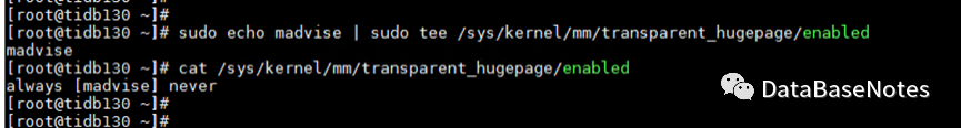 sudo echo madvise | sudo tee sys/kernel/mm/transparent_hugepage/enabled