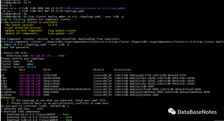 tiup cluster deploy amber v5.4.0 ./topology.yaml --user tidb –p