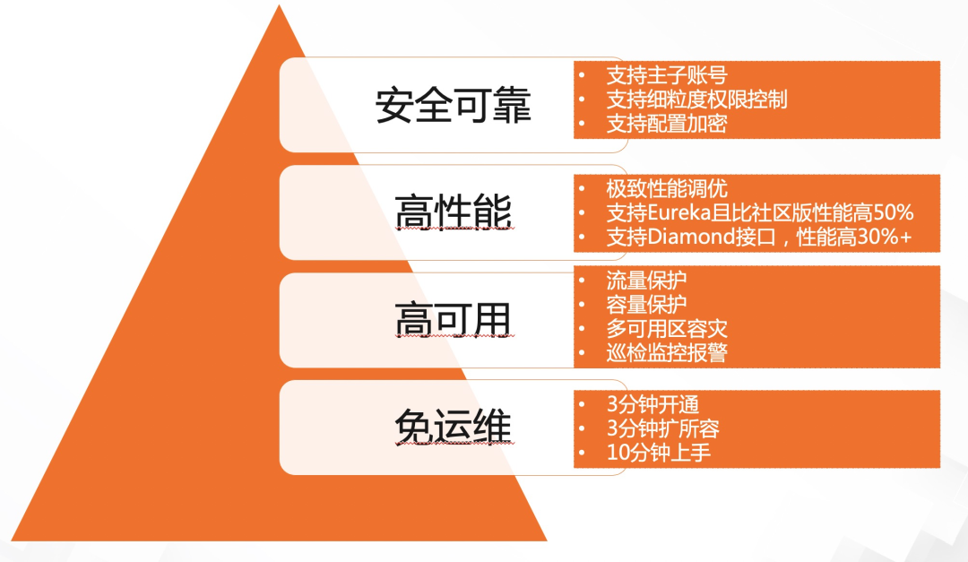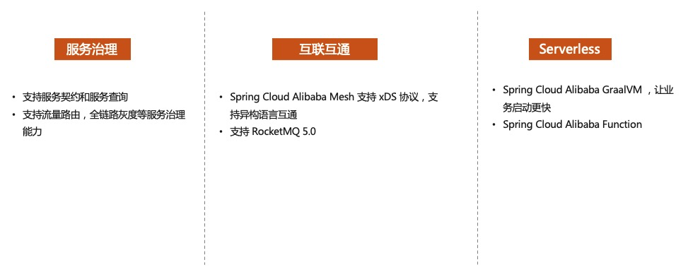 推动服务治理标准化,全面升级服务治理能力,支持服务契约和服务查询能力,以及流量路由等等高阶治理能力。 继续和其他微服务进行互通,通过支持 xDs 协议和 Service Mesh 进行互通。 结合 Serverless 场景,支持 GraalVM,让 Spring Cloud 开发的微服务,在 Servless 架构下拥有更快的启动速度,和享受 Serverless 云服务(例如阿里云 Serverless 应用引擎 SAE)带来的更好的弹性。