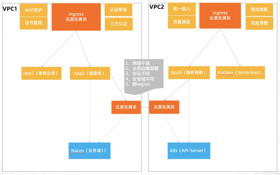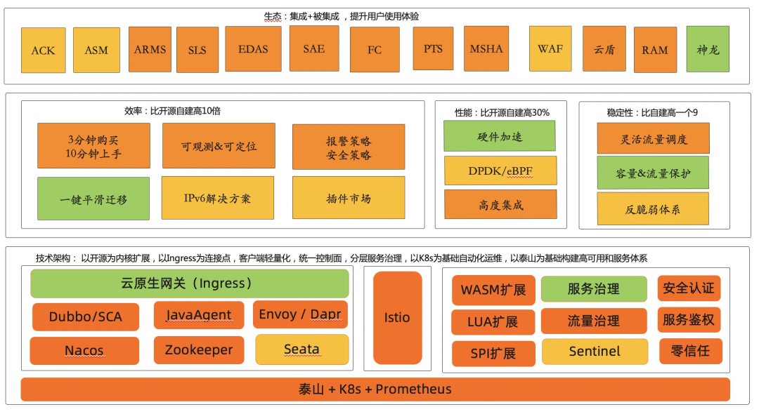 高集成:集成流量网关+微服务网关+WAF 多种网关,集成 Nacos/Kubernetes/DNS/固定 IP 多种服务发现方式,集成 ARMS/SLS 可观测监控报警体系,集成证书/三方认证安全体系。 高可用:提供多可用区容灾,默认监控报警策略,推空保护,支持限流降级,支持流量灰度。 高性能:采用硬件加速性能提升 80%,Ingress 场景比 Nginx 性能高 90%,参数调优+模块优化提升 40%,将流量网关和微服务网关二合一。 安全:支持证书管理,支持 JWT/OAuth2/OIDC/IDaaS 认证机制,支持黑白名单机制。