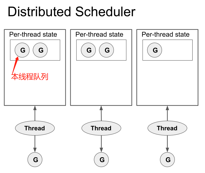 通过数据分治的思想,我们就可以得到改进的方案:每个线程分别处理一批G,进行线程分治。将所有G分开放到各线程自己的存储中,即所谓的Local Run Queue中。示意如下: