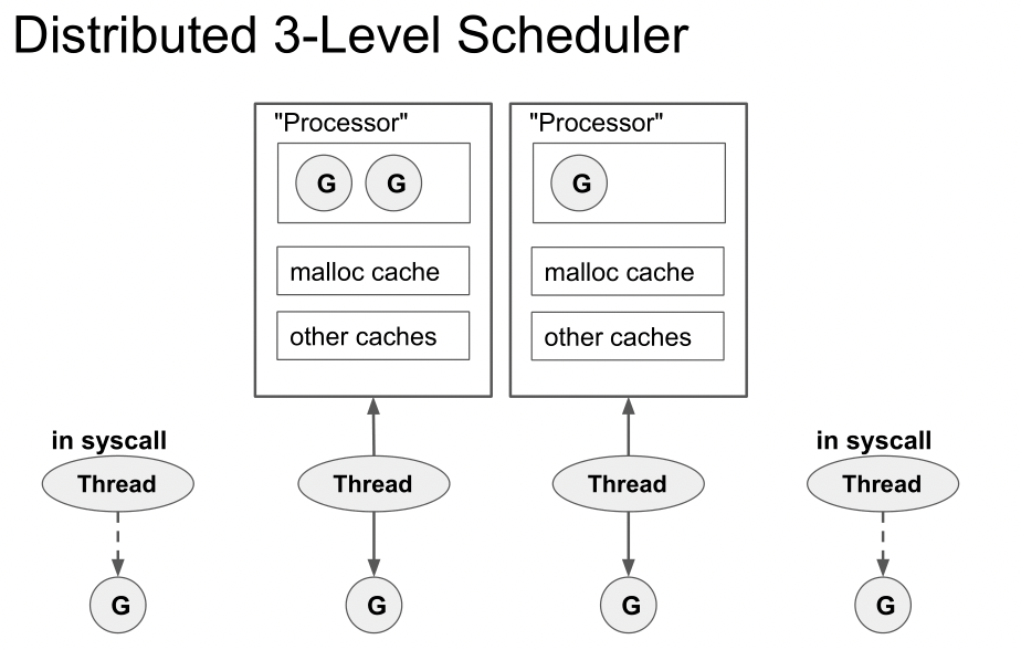 注:除了高效之外,还有其他几个目标,如无大小限制的goroutine栈,公平的调度策略等。