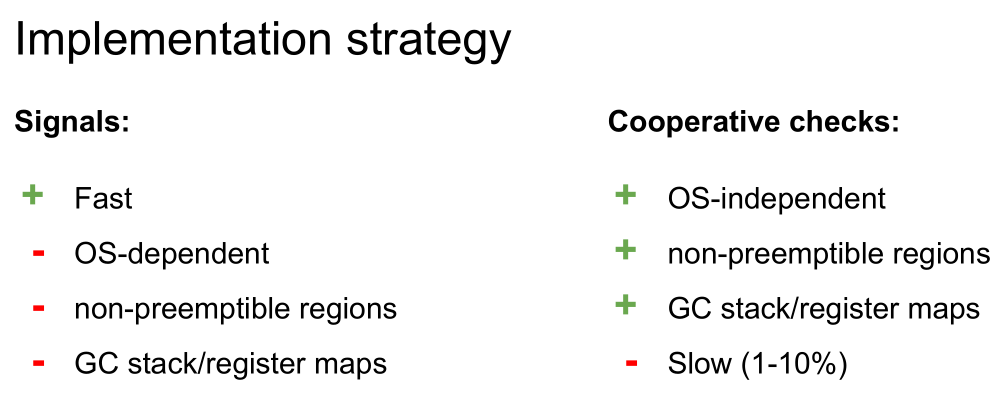 对于Cooperative checks的方案,从代码编译生成的角度看,很容易做check指令的埋点。且因为golang本来就要做动态增长栈,在函数入口处会插入检查是否该扩栈的指令,正好利用这一点来做相关的检查实现(这里有一些优化细节,可以使得基于时间片的抢占开销也较小)
