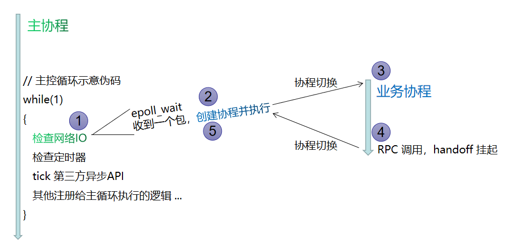协程切换示意图,图注:1、2、5在主协程,3、4在业务协程,主协程和业务协程都在主线程内。