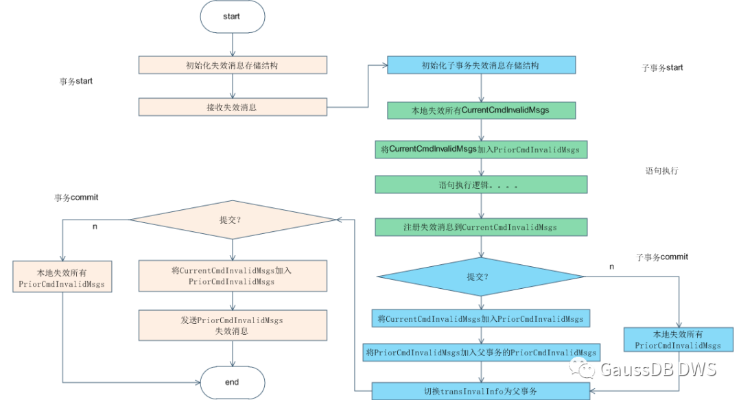 在事务开始时,本线程将主动接收并处理失效消息队列中的消息。在开启子事务时,会初始化失效消息存储结构,主要包括两部分结构,CurrnetCmdInvalidMsgs(当前失效消息),主要存储当前执行语句产生的失效消息,PriorCmdInvalidMsgs(历史失效消息),主要用于存储从事务开启到当前时间点,产生的失效消息,其中CurrnetCmdInvalidMsgs和PriorCmdInvalidMsgs均为ThreadLocal结构。