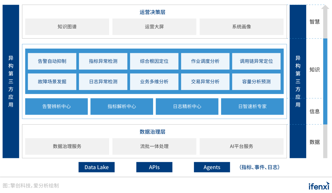 随着E银行数字化转型进程的不断推进,银行业务系统和基础架构愈发复杂,运维数据日益增长,运维能力越来越成为E银行数字化转型的重要关注点。业务量的不断增长,为传统的IT运维带来了以下四个方面的问题:第一,数据治理难。随着数字化的演进和全行改革的深入,E银行业务量增多,数据规模急剧扩大,且数据种类与数据结构愈发复杂多样,由于数据标准不统一,因此数据质量较低;且E银行数据分散在各应用处、集中度不高,数据之间存在孤岛现象,数据可复用能力欠缺。第二,发现问题难。E银行在过去便建立了运维系统,但随着该系统在业务中的不断实践,出现了不少问题。首先,监控不全面,缺乏对整体业务运行状态的监控;其次,原有运维监控系统采用固定阈值告警,误报漏报率高;另外,原有运维系统发现问题较为被动,缺乏趋势预测能力,无法在用户受影响之前及时识别问题,严重依赖运维人员经验,导致运维成本高、运维效率低。第三,根因定位难。E银行原有运维系统和工具基本为事后统计分析,缺乏实时分析能力,缺乏以业务指标驱动的根因分析能力、场景化的相关性分析能力和告警、指标、日志等多维数据的交叉分析能力,对运维排障能力的提升作用很有限,导致运维故障处理能力较低。第四,运营分析难。E银行传统运维系统主要依赖人工经验、通过报表来分析数据,缺乏智能化的手段进行动态数据分析;过去的运维数据分析主要从运维角度而从非业务视角出发,导致对数据的分析较为片面、落地性不强,数据价值挖掘不充分,无法为综合运营提供保障支撑。除此,E银行还有一些定制化的需求。E银行部署了云平台,不同于传统技术架构,云平台对运维侧提出了更多需求,如与态势感知可视化工具进行深度结合,以识别并解决云上安全风险;另外,E银行对于内部安全能力也有要求,随着业务量的增加,内部违规操作的几率增加,E银行对内部人员违规操作的检测排查提出了新需求,对安全数据的整合能力成为了E银行重要的关注方向。综上,借助一定的手段和方式,对客户的IT运维数据实现全量的集中化管理,实现数据实时处理、智能分析和预测,进行多维度高效根因定位,实现运维侧的全面升级,成为E银行数字化转型的重要诉求。基于此,E银行选择与擎创科技进行合作,就智能运维AIOps展开深度探索。擎创科技2016年成立于上海,是国内首家智能运维AIOps落地解决方案的供应商。擎创科技专注于以AI赋能运维管理,激活运维数据智慧,助力客户数字化转型。目前其客户群已覆盖银行、保险、证券、制造、能源及交通运输等多个行业。擎创科技基于自身强大的大数据能力、流批一体处理能力和AI算法能力,从数据治理层(包括数据采集、数据处理、数据存储)、运维应用层以及运营决策层多个层级,为E银行提供了智能运维夏洛克AIOps全面解决方案。