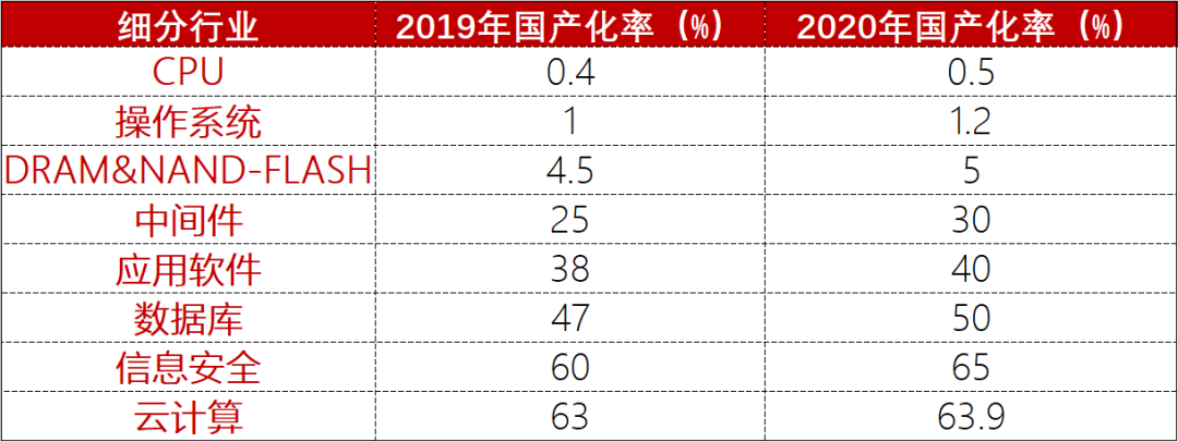 编者按:中国信创产业提出的核心为“国产化”,在本文定义的信创领域中,不同的细分领域现阶段国产化率也存在一定差异。在综合市场各方数据后对于现阶段中国信创各细分行业的国产化率进行了估测,得到数据结果显示,中国CPU和操作系统领域国产化比率相对较小,2020年两个领域国产化率分别仅为0.5%和1.2%,其未来可发展增长空间较大。2019-2020年国产化率变动幅度不大与中国中间件国产化替代进程和中间件企业供应能力受限有一定关系,但未来随着信创产业的发展,中间件国产替代进程或会出现较大规模增长。