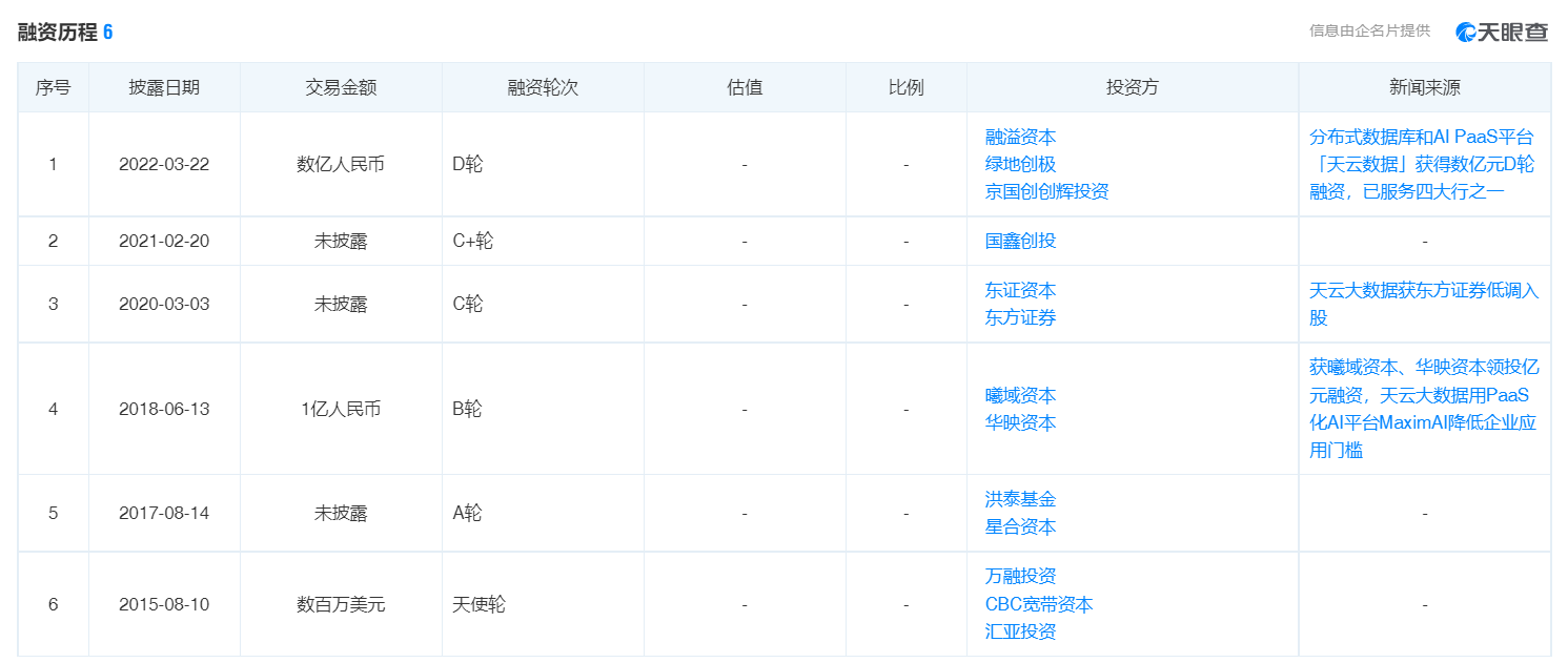 2022年3月21日,国产数据库厂商天云数据获得数亿元D轮融资。本轮由多家国家队基金共同投资,包括:北京市国资委旗下创新投资平台北创投管理的、科技部和北京市科创基金共同支持的北京市首支央地联动科技成果转化子基金远京基金、上海市国资委旗下绿地创极管理的苏州吴江太湖新城母基金。2021年,天云数据还曾获得上海国资旗下国鑫创投的投资。