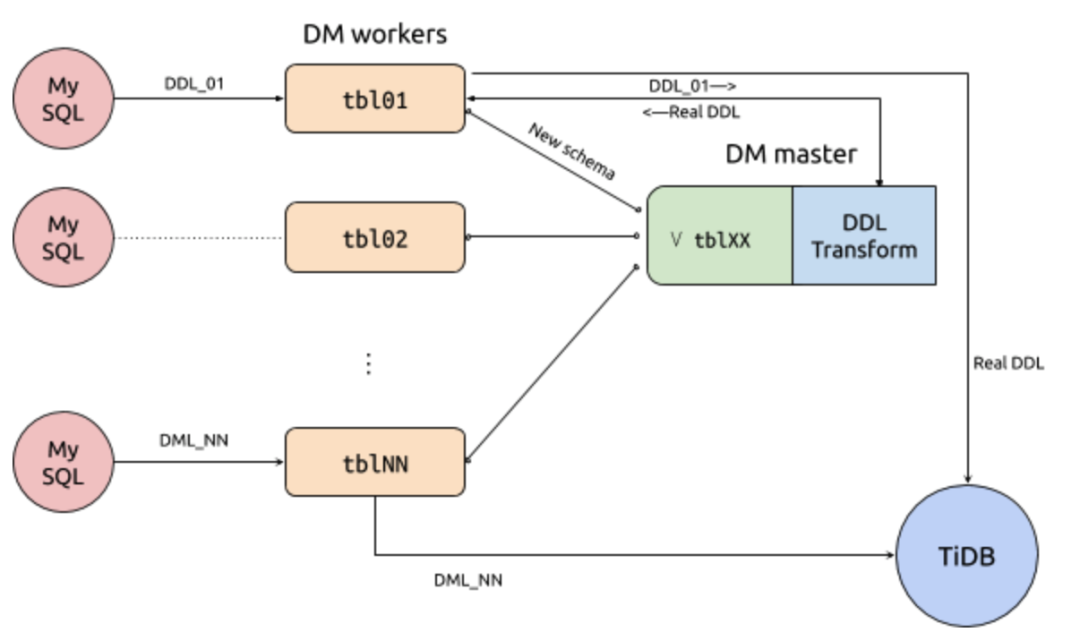 在乐观协调模式下,DM-worker 接收到来自上游的 DDL 后,会把更新后的表结构转送给 DM-master。DM-worker 会追踪各分表当前的表结构,DM-master 合并成可兼容来自每个分表 DML 的合成结构,然后通知相应的 DM-worker 把与此对应的 DDL 迁移到下游;对于 DML 会直接迁移到下游。