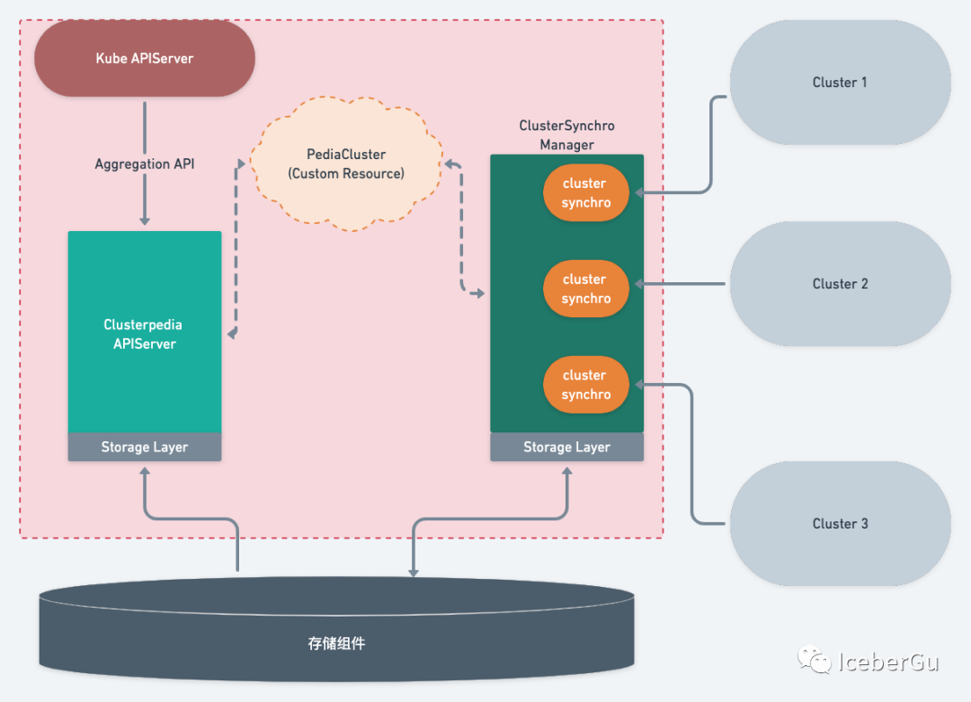 Clusterpedia APIServer:以 Aggregated API 的方式注册到 Kube APIServer,通过统一的入口来提供服务。