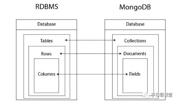 与传统的RDBMS关系型数据库不同,MongoDB并没有表Table,行row和列column的概念。它将数据存储在集合collections,文档documents和字段fields中。下图说明了与RDBMS类比的结构之间的关系: