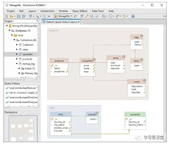 DbSchema是可以很好地完成可视化设计工作的一个工具。如下图所示,它将通过读取集合和文档来推导架构。此外,您只需单击就可以修改图中的对象。在DbSchema中,您还可以为MongoDB创建外键,当然仅在本地创建,只用于设计目的。