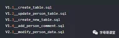 大写V后面紧跟数据库脚本的版本号(递增形式、不能重复),然后两个下划线,之后是对脚本内容进行描述。如:V1.1__create_table.sql是用于创建表结构的数据库脚本,内容是create table之类的DDL。 第二个脚本是对数据库中person表进行了更新。总之脚本里面的内容,就是你希望对spring.datasource代表的数据库进行的操作,可以是表的创建、删除、修改,也可以是对数据的创建删除修改。
