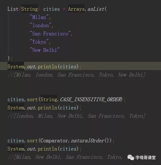如果使用Comparator.naturalOrder()字母自然顺序排序,结果是:[Milan, New Delhi, San Francisco, Tokyo, london]