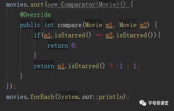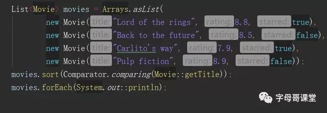 然后重点的的代码:使用了函数应用Movie::getTitle作为对象的排序字段,即按照电影的title作为排序字段