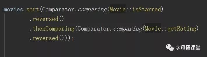 如果我们希望List按照Title的倒序排序,就使用reversed()方法。如:Comparator.comparing(Movie::getTitle).reversed()。
