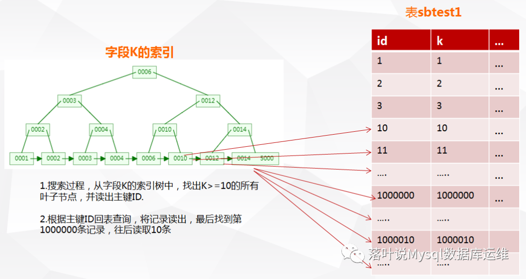 mysql> select a.* from sbtest1 a inner join (select id from sbtest1 where k>=10 order by k limit 1000000,10) b using (id);+---------+---------+-------------------------------------------------------------------------------------------------------------------------+-------------------------------------------------------------+| id | k | c | pad |+---------+---------+-------------------------------------------------------------------------------------------------------------------------+-------------------------------------------------------------+| 625795 | 2491354 | 97204650565-29444916083-97115589676-40957844519-94449833558-65804998462-60532777657-14143069112-49633654712-45111409020 | 62512103246-48607606334-30155359433-33452555729-53895828100 || 699397 | 2491354 | 32339675223-04668542998-80231026645-48395677535-02765586559-55831506063-42378875097-54580937047-37599981559-17618207647 | 29107597440-02396388801-60803416516-20183514546-47217028215 || 710717 | 2491354 | 90067622196-22944775363-10477154003-65718440755-24111522288-05149673185-81902474191-32337446442-26659698531-19766723590 | 86804024266-77223258212-31659403967-01772860244-99013209389 || 743592 | 2491354 | 93848584940-19743659878-81447583142-56888444937-65254387827-69794611882-41783362491-17920606195-80837332876-61005171709 | 18905422789-64525703285-24594762685-66972415320-18032736842 || 857338 | 2491354 | 65447608668-53055131627-49484988592-56750024449-62428854104-09419771096-35386440425-85674387129-76043542898-38871555063 | 00988589677-01502672421-94556913009-28600249646-25815466940 || 865647 | 2491354 | 40627346200-31156486805-14979452789-43576795710-31471455633-50576965996-46658943363-33235956457-29071759844-01216446475 | 77768402076-66310138953-89244891269-40818622962-29528856272 || 867735 | 2491354 | 60189133283-00412480472-85765718780-99930014238-27634346893-05196495869-38494141485-78725336333-97665769760-66018168229 | 51330855469-21834479110-70983834788-18568325279-18729638102 || 911459 | 2491354 | 45484218970-22406621124-16181607460-87980700413-18848748487-38186811906-83866179899-48052521037-07022164880-32639610985 | 66781406596-73096831064-93546863231-94196105489-63929163328 || 936676 | 2491354 | 94497954531-98116538211-42837637393-90318550621-31404186605-85978752098-54751837452-40263829756-21584452095-09911571729 | 57946842290-70811751667-96407003836-80311371855-21528783577 || 1117598 | 2491354 | 01895171691-22358407775-28637603773-13518829168-90455880119-28672508798-65059848567-86474578422-79051749776-25498873626 | 19312889757-23713866145-22328278494-54535848675-44626652413 |+---------+---------+-------------------------------------------------------------------------------------------------------------------------+-------------------------------------------------------------+10 rows in set (0.31 sec)