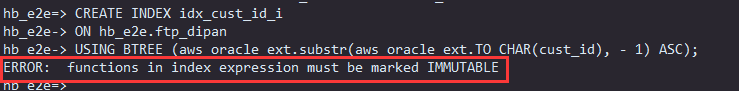 CREATE INDEX "HB_E2E"."IDX_CUST_ID_I" ON "HB_E2E"."FTP_DIPAN" (SUBSTR(TO_CHAR("CUST_ID"),-1)) 而在PostgreSQL中执行则报ERROR: functions in index expression must be marked IMMUTABLE |