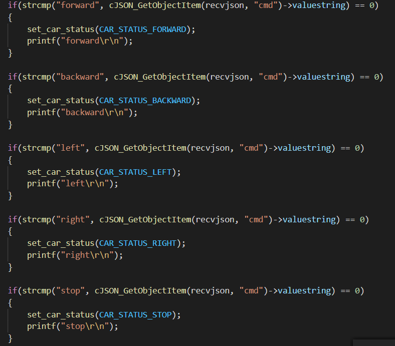 这里使用的通信格式是 json,小车收到 UDP 数据后,解析 json,并根据命令执行相应的操作,例如前进、后退、左转、右转等。