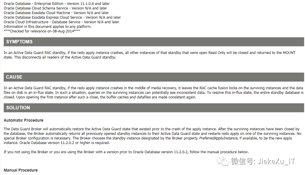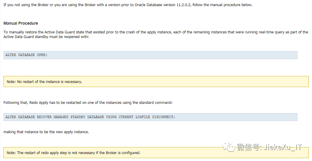 大概意思就是说,如果 apply redo 应用日志的实例进程异常终止后,其它所有OPEN READ ONLY 的实例会 close, 因为在 RAC ADG 环境中,如果实例在应用日志过程中中断 crash, 会把CACHE FUSION 的锁留到残留幸存的实例中,会导致数据查询不一致,因次需要关闭数据库,重新打开来保证 buffer cache 和 datafile 的一致状态。如果配置了 DG Broker 这个操作可以自动完成, 版本大于11.2.0.2,如果没有配置 DG broker,手动方式直接 open 就可以了,接着手动执行应用日志命令,不需要重启实例,继续在幸存的节点上应用日志。