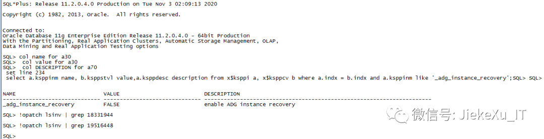 SQL> col name for a30SQL> col value for a30SQL> col DESCRIPTION for a70SQL> set line 234SQL> select a.ksppinm name, b.ksppstvl value,a.ksppdesc description from x$ksppi a, x$ksppcv b where a.indx = b.indx and a.ksppinm like '_adg_instance_recovery';NAME VALUE DESCRIPTION------------------------------ ------------------------------ ----------------------------------------------------------------------_adg_instance_recovery FALSE enable ADG instance recovery
