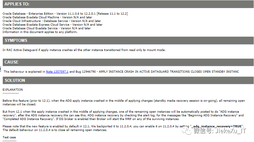 EXPLANATION--------------Before this feature (prior to 12.1), when the ADG apply instance crashed in the middle of applying changes (standby media recovery session is on-going), all remaining open instances will be closed.But from 12.1 when the apply instance crashed in the middle of applying changes, one of the remaining open instances will be automatically posted to do "ADG instance recovery", after the ADG instance recovery.We can see this,ADG instance recovery by checking the alert log, for the messages like "Beginning ADG Instance Recovery" and "Completed ADG Instance Recovery".If DG broker is enabled then Broker will start the MRP on any of the surviving instances.Please note that the new feature is enabled by default in 12.1. We backported it to 11.2.0.4, you can enable it on 11.2.0.4 by setting "_adg_instance_recovery=TRUE".The default behaviour on 11.2.0.4 is to close all remaining open instances翻译:在此特性之前(12.1之前),当 ADG apply 实例在应用更改的过程中崩溃(备用媒体恢复会话正在进行)时,所有剩余的打开实例将被关闭。但是从 12.1 开始,当应用实例在应用更改的过程中崩溃时,在 ADG 实例恢复之后,剩余的一个打开的实例将被自动提交去做“ADG实例恢复”。我们可以通过查看警报日志看到 ADG 实例恢复,对于“开始ADG实例恢复”和“完成ADG实例恢复”这样的消息。如果 DG broker 是启用的,那么 broker 将在任何存活的实例上启动 MRP。请注意,12.1 中的新特性是默认启用的。我们将它向后移植到 11.2.0.4,您可以通过设置 “_adg_instance_recovery=TRUE” 在 11.2.0.4 上启用它。11.2.0.4 的默认行为是关闭所有其余打开的实例。