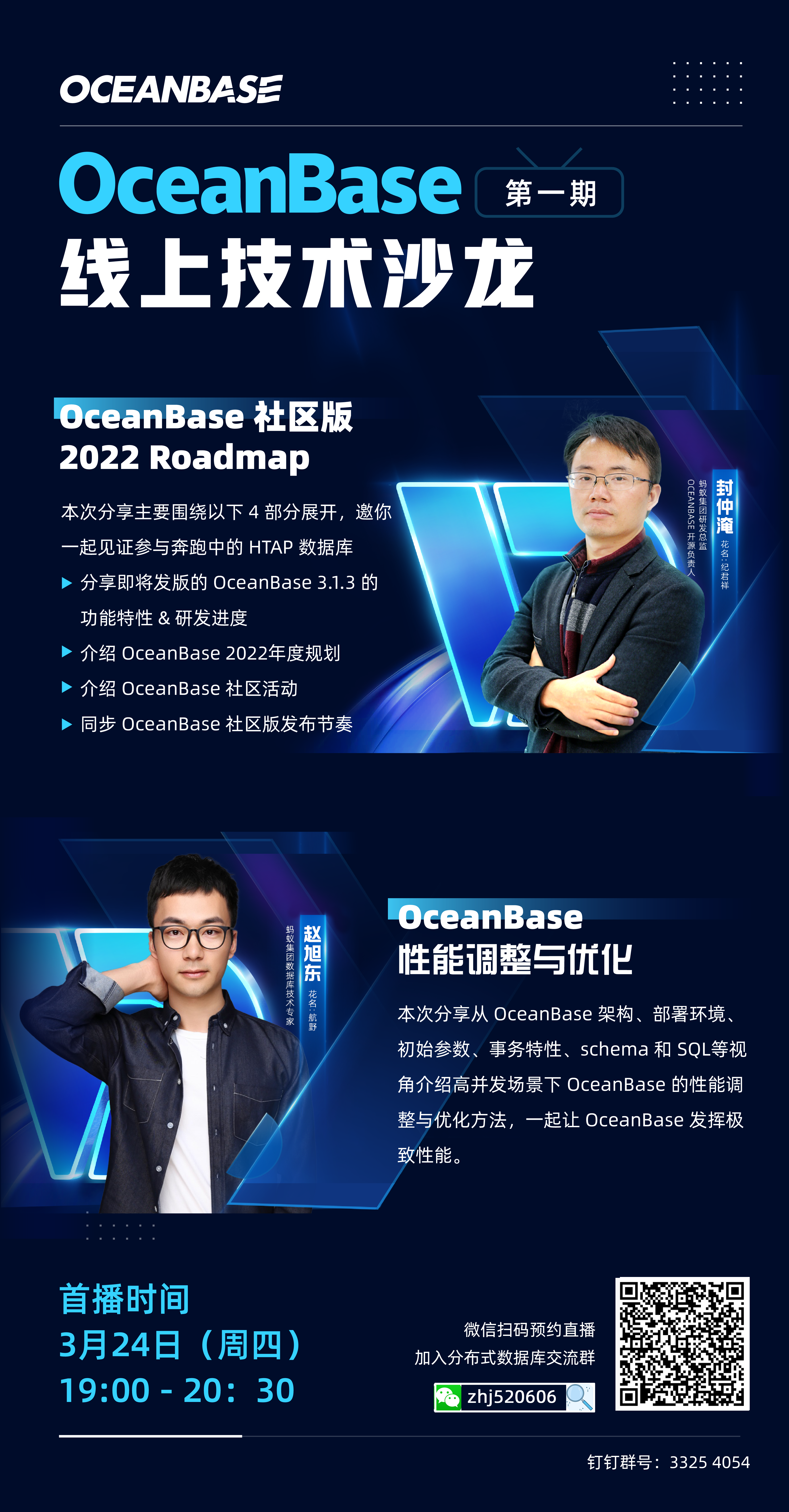 3 月 24 日,锁定 19:00-20:30 播出的第一期内容,OceanBase 研发总监兼开源负责人封仲淹及蚂蚁集团数据库技术专家赵旭东将为大家带来 OceanBase 2022 Roadmap 及运维实战分享。欢迎提前扫码进群预约直播,也欢迎有更多对分布式数据库技术感兴趣的同学,加入 OceanBase 社区观看直播,参与技术讨论。