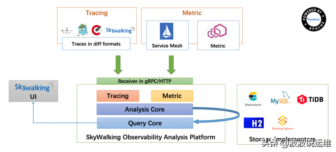 平台后端 支持数据聚合, 数据分析以及驱动数据流从探针到用户界面的流程。分析包括 Skywalking 原生追踪和性能指标以及第三方来源,包括 Istio 及 Envoy telemetry , Zipkin 追踪格式化等。你甚至可以使用 Observability Analysis Language 对原生度量指标 和 用于扩展度量的计量系统 自定义聚合分析。