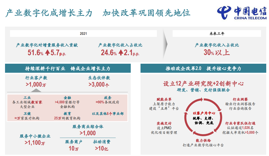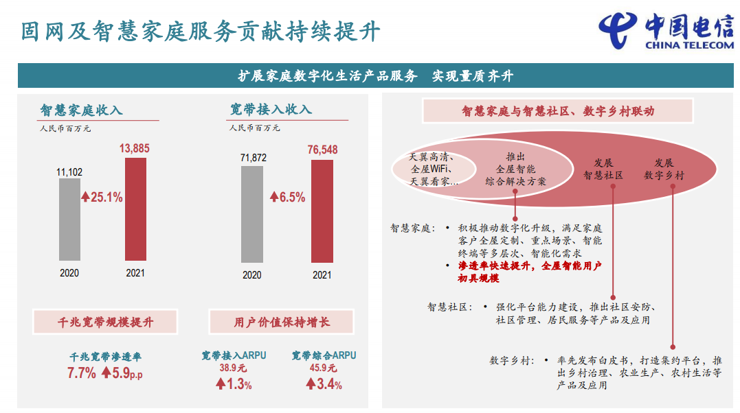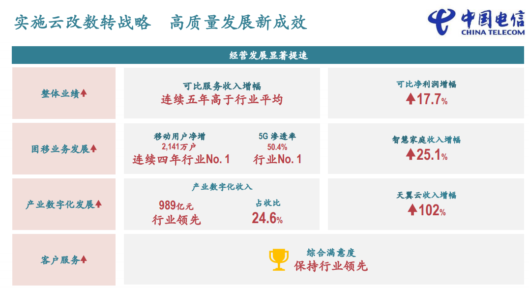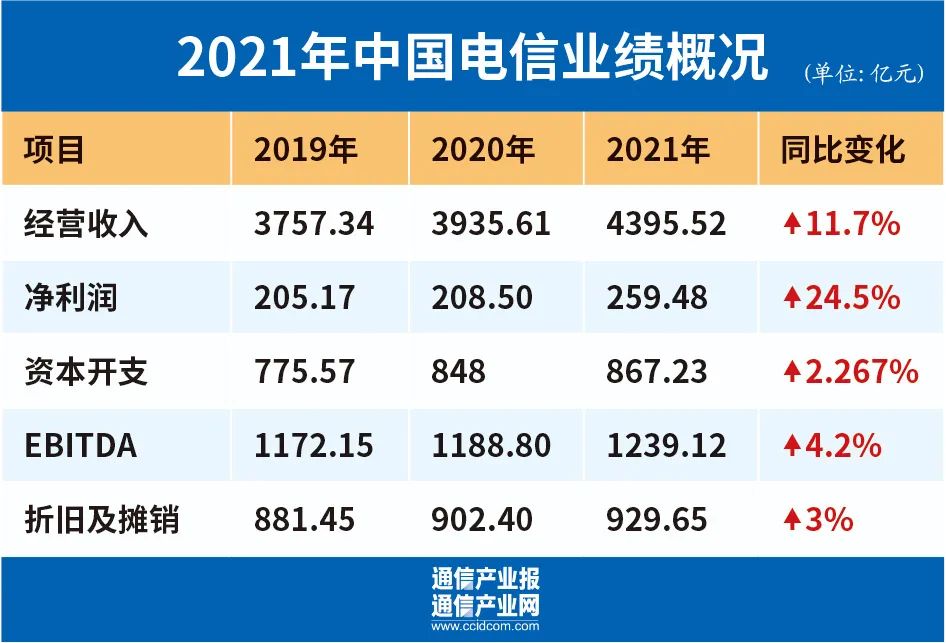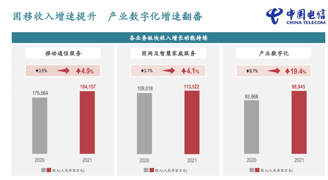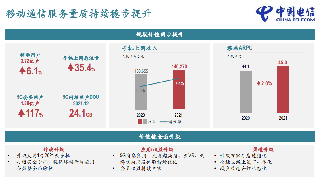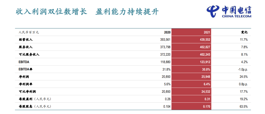 2021年中国电信实现了营收和利润两个双位数增长。2022年资本开支为930亿元,5G投入将下降10.5%,数字化转型投入将增加62%。