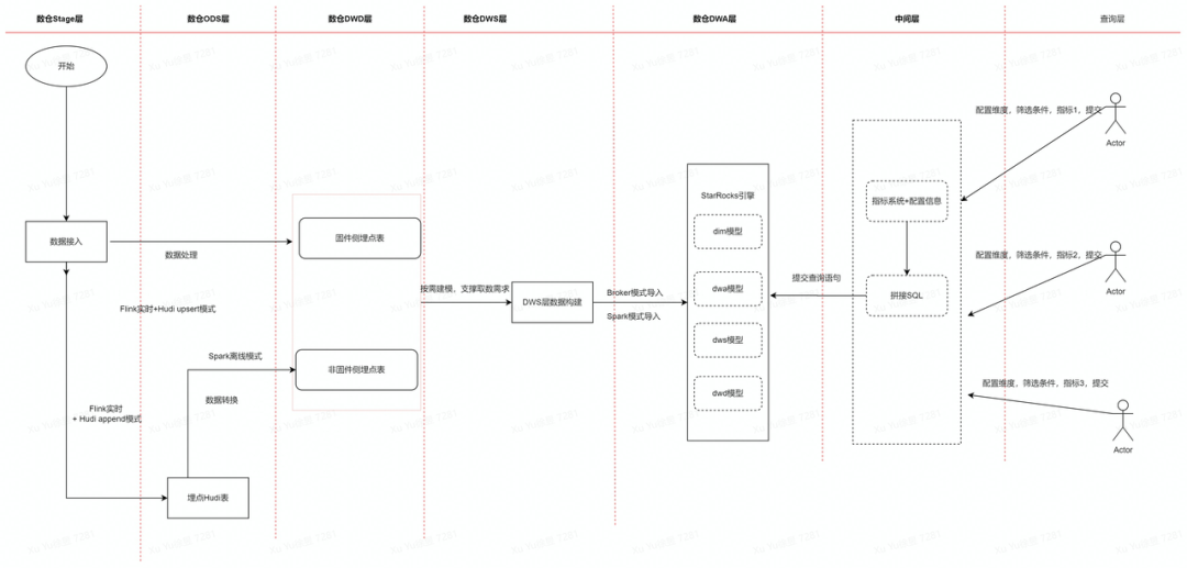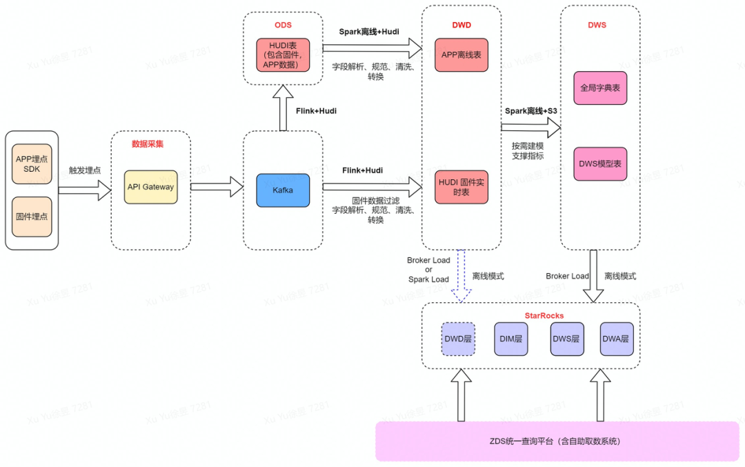 当前产线埋点数据主要来源于 App 以及固件上传的埋点数据,数据经由网关转入 Kafka,采用 Hudi on Flink 的模式进行数据清洗、过滤、转换,基于流式数据湖构建 OLAP 的预处理层。根据数据特性和写入的性能要求,分别基于 Hudi 的 Upsert 和 Append 模式构建 DWD 层(借助 Hudi 的去重、追加能力),定时离线处理数据转入 DWS,考虑数仓的整体架构以及成本优化,将 DWS 数据定时离线导入到 StarRocks 中。最后经由 ZDS(Zepp Data Studio,华米大数据统一查询平台)查询 StarRocks 数据。