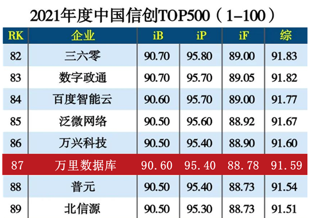因数据库自主研发及生态链建设的一系列成果,万里数据库不仅入围了互联网周刊去年同期发布的信创Top500榜单,更与华为、麒麟、龙芯等国产生态圈头部企业一同荣登2021信创领军企业100强,表明万里数据库的产品技术实力及信创领域的贡献受到权威机构认可。