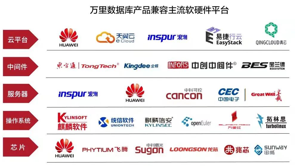 生态建设层面,万里数据库GreatDB与操作系统、中间件、CPU等国产主流软硬件平台进行了兼容适配认证,建立了完善的上下游产业生态链,积极助力信创产业发展。