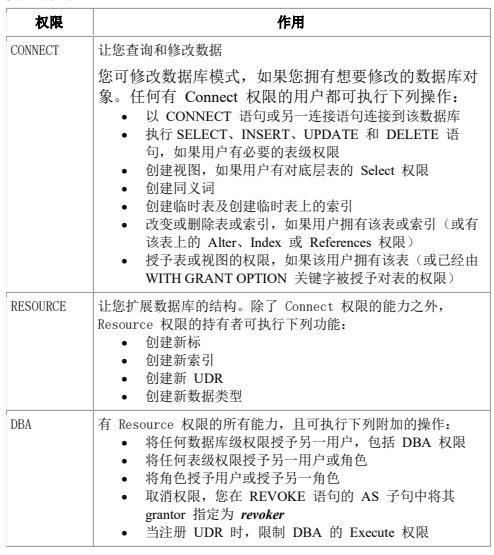从最低至最高,数据库访问级别为 Connect、Resource 和 DBA。请使用相应的关键字来授予访问